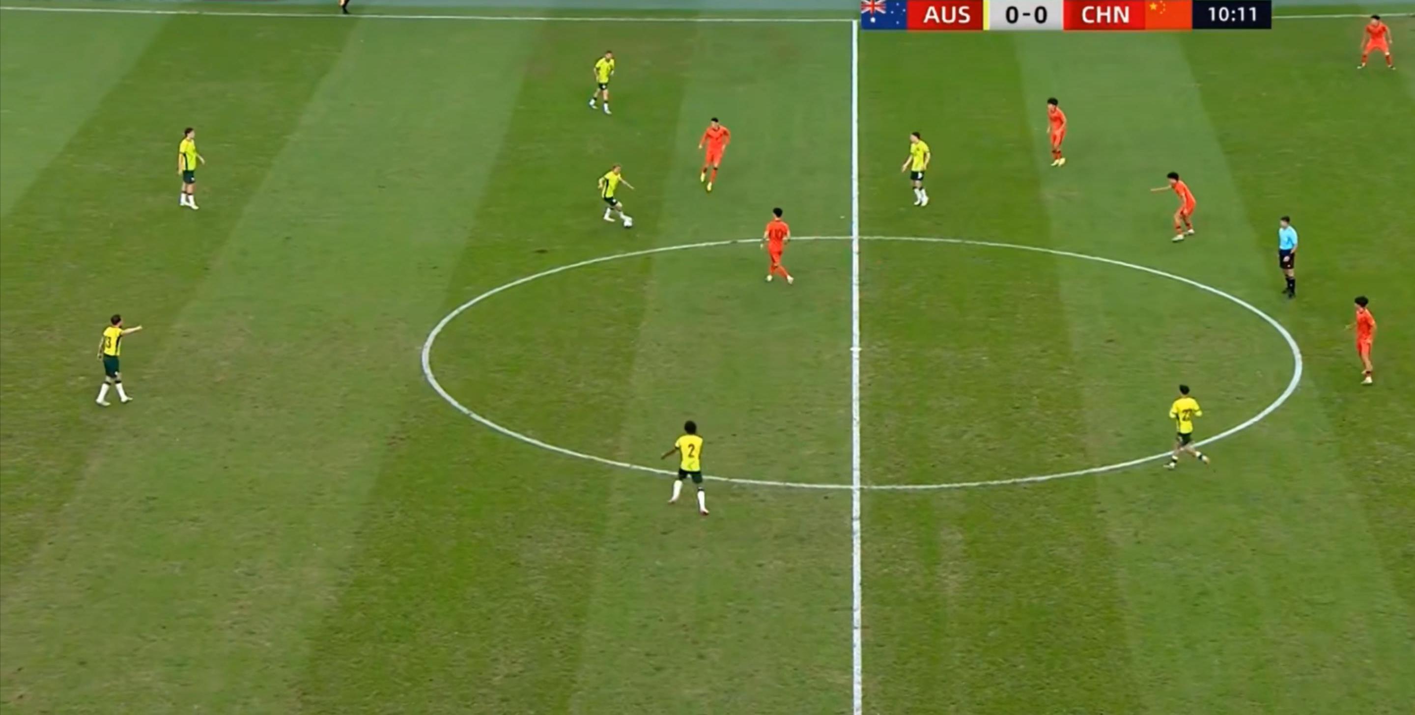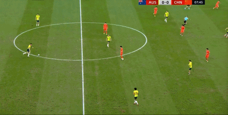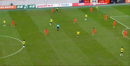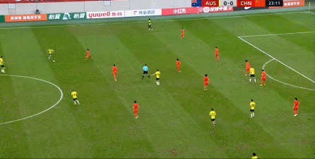 这样的站位,显然在宽度上完成了尽量的覆盖,而且在战略上,中国队在主场打得也很保守,澳大利亚在较深位置持球时,中国队并不会选择积极的压迫和逼抢,任由对手起球: