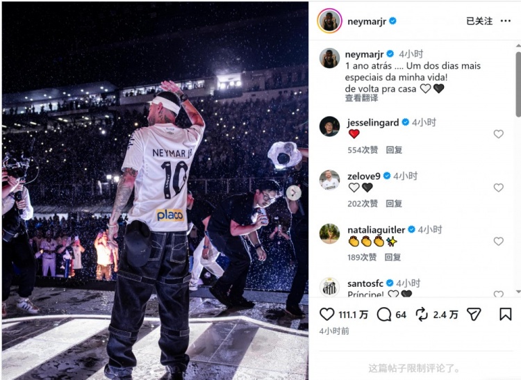 内马尔社媒晒出回归桑托斯时的照片,并配文:“一年前,我生命中最特别的日子之一,回家。”