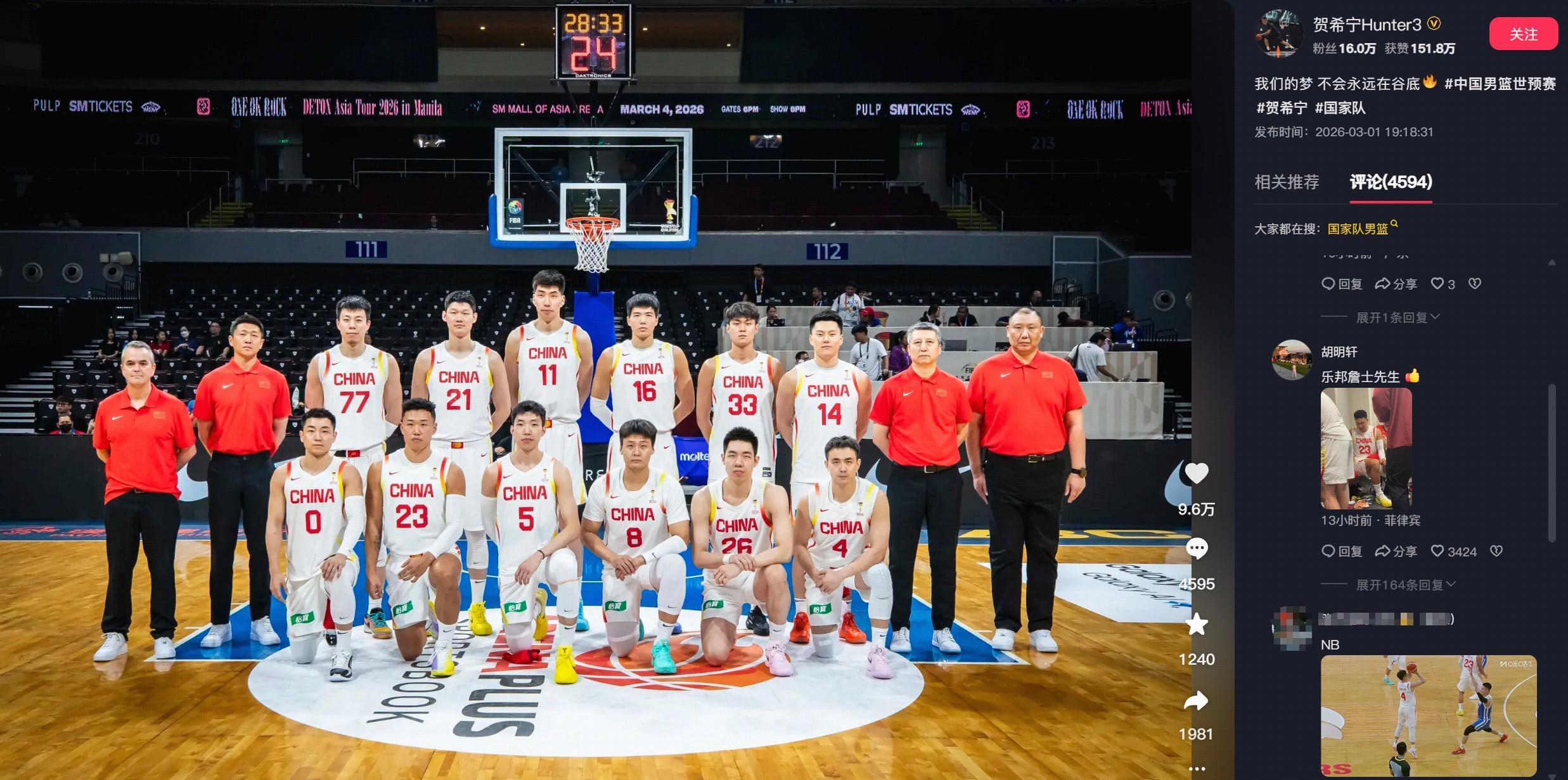 北京时间3月1日,男篮世界杯预选赛,中国男篮在中立场地菲律宾逆转中国台北男篮,取得两连胜。贺希宁本场比赛表现出色,首发登场20分钟得到10分1板1助,赛后,球员在社媒分享赛前大合影庆祝胜利。胡明轩在评论区晒出贺希宁在更衣室的图片,配文:乐邦詹士先生。...
